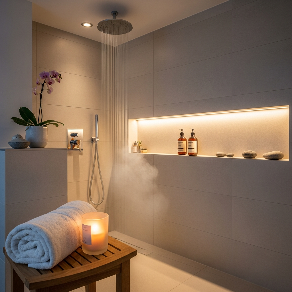 A calm evening shower creates a reliable bridge between a busy day and a restful night. The warm water, predictable order, and low-stimulation setting help signal that it is time to slow down.